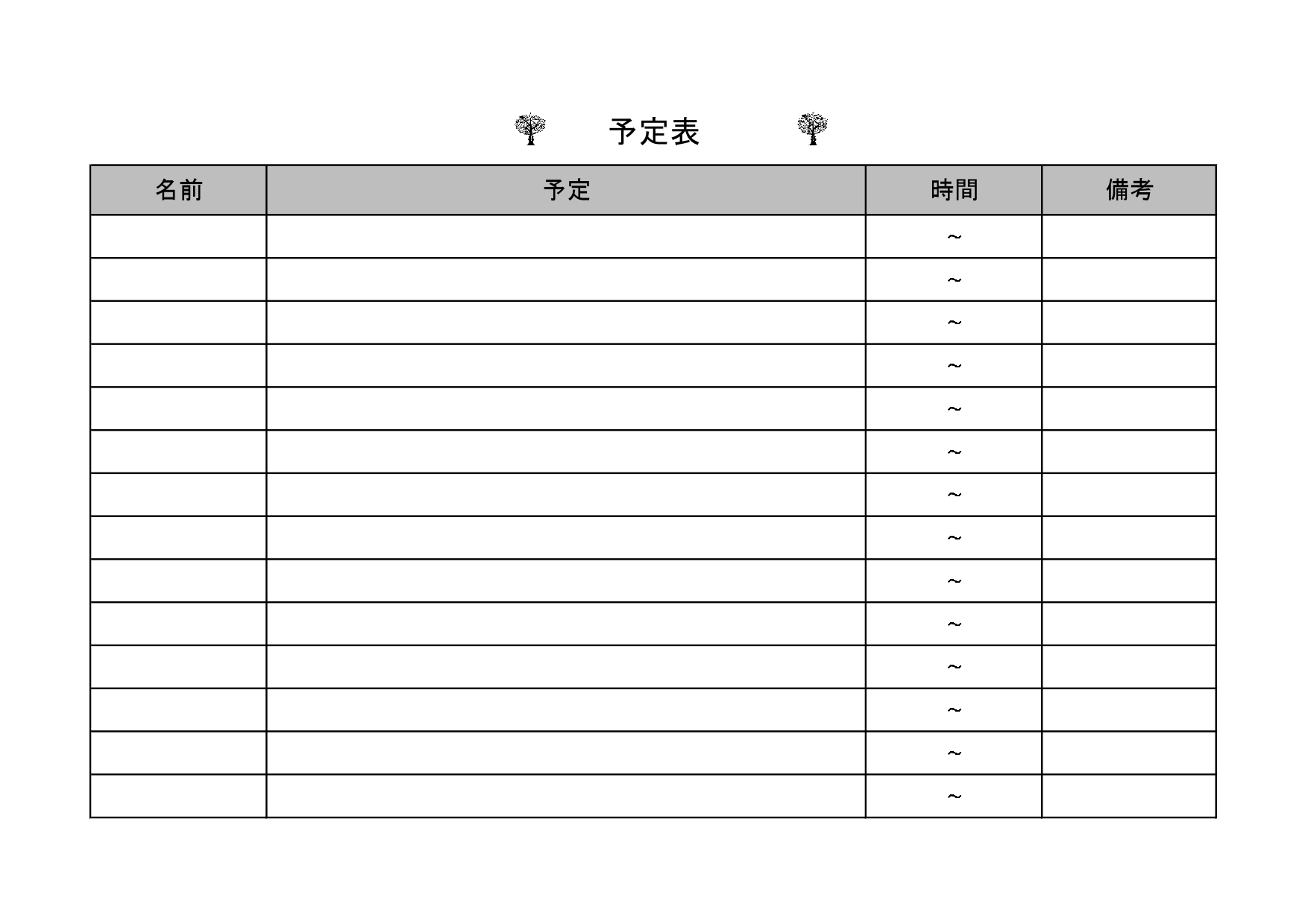 ビジネス・業務で使える!予定表「Excel・Word・PDF」シンプルな「氏名」「予定」「時間」「備考」のみの項目のテンプレートとなります。ダウンロード後に利用出来る、簡易的な予定表となります。簡単な予定表の作成や提出が必要な場合におすすめのフリー素材となります。