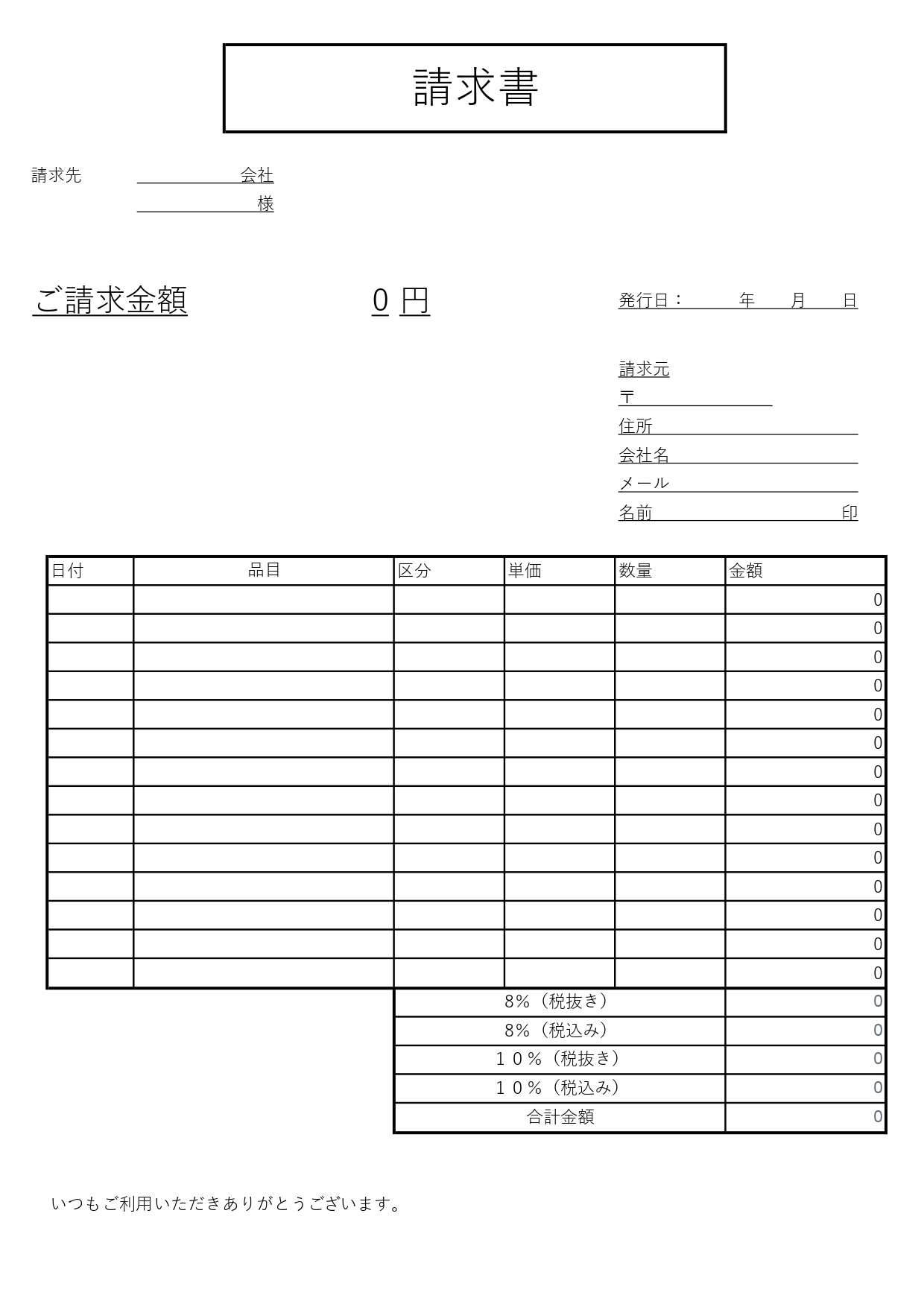 請求書(記入例あり)シンプルで見やすいサービスの報酬や納品した商品で、使えるテンプレートとなります。ダウンロードを頂く事で、「pdf-word-Excel」が利用可能となります。シンプルなデザインで、ビジネス相手や取引先など幅広い用途で利用