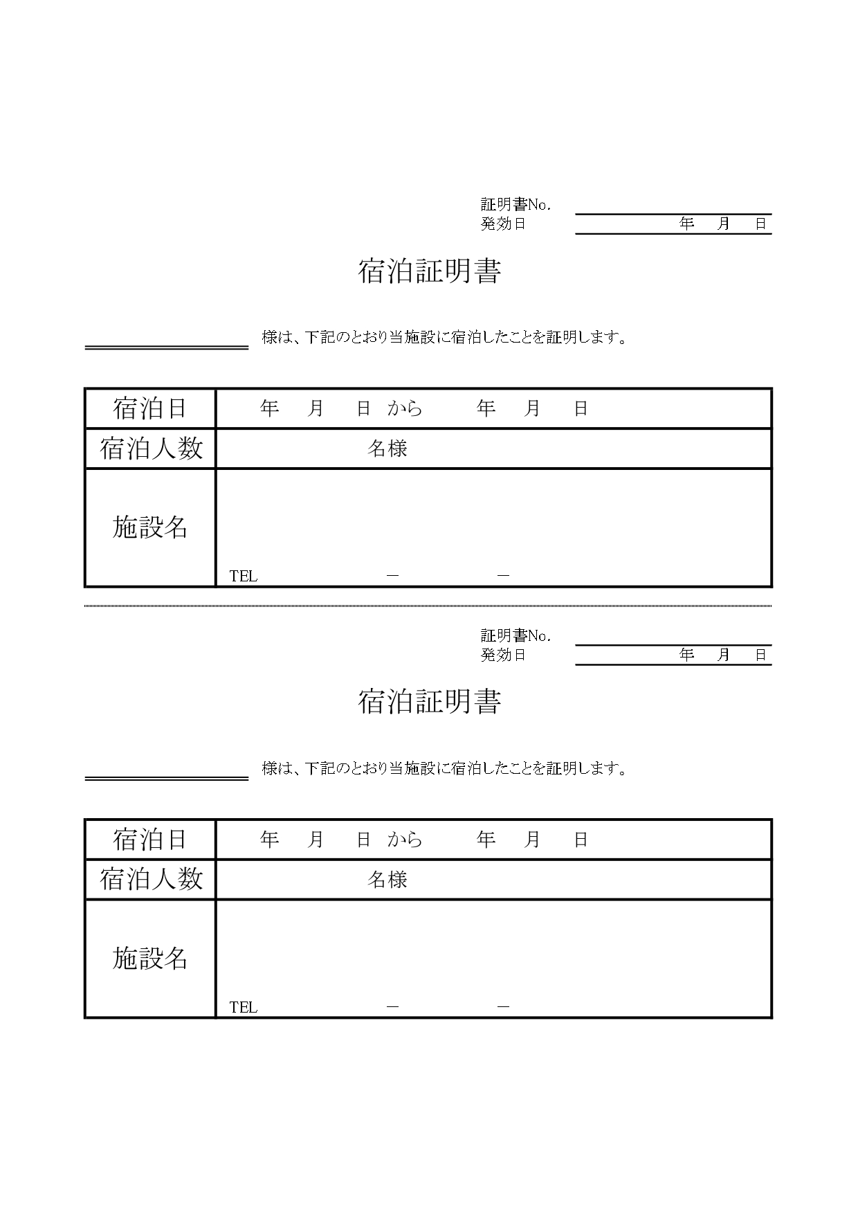 ホテルや旅館等の宿泊証明書(簡単編集・A4・2枚・Excel・Word・PDF)のフォーマットとなります。簡易的に印刷し手書きを行う事や、エクセルやワードでホテル名や旅館名などを記入し発行する事も可能です。1枚を控えとし保管するなども可能なテンプレートとなります。ダウンロード後にご利用頂けます。