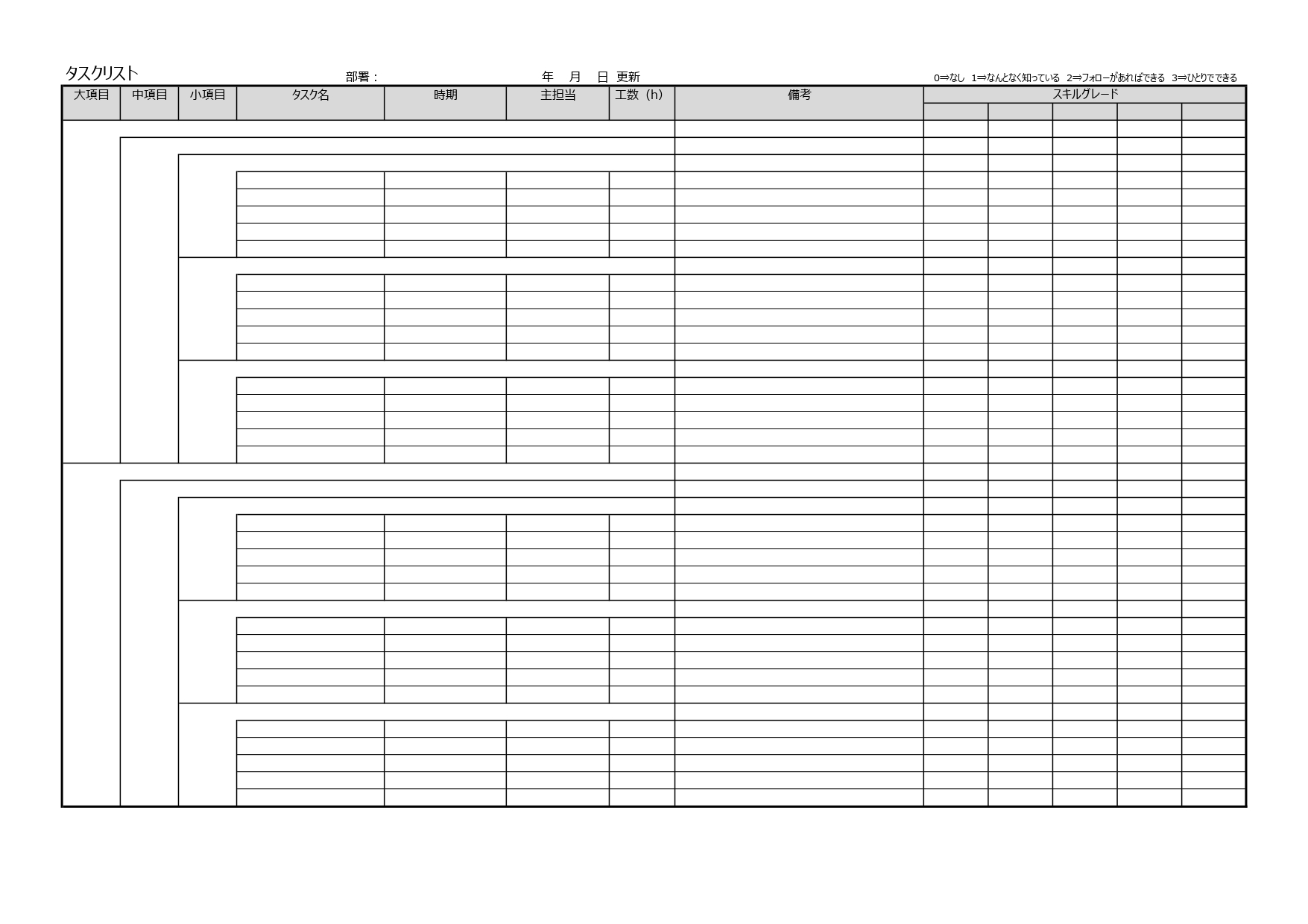 建設関連の事業者が利用しやすい、便利なタスクリストです。こちらのタスクリストには、大項目、小項目、タスク名、時期、工数、備考、スキルグレードが記載されているので便利です。サンプルとして記入したエクセルがありますので、見本やサンプルとし用途に合わせて作成が可能です。