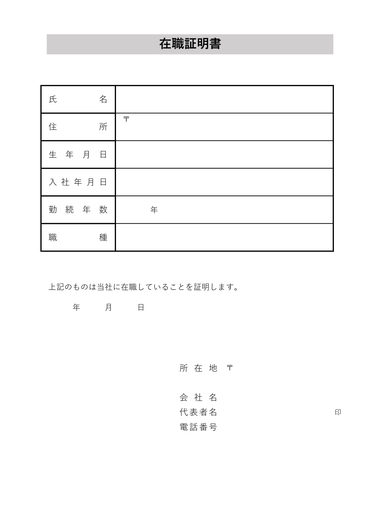 PDFに関しましては、印刷をして使用頂けますので、日付・勤続年数の部分も手入力となります。所在地、会社名、代表者名、電話番号のところは記入しやすい様に罫線を引いております。在職証明書のテンプレートは無料でダウンロード出来る素材となります。
