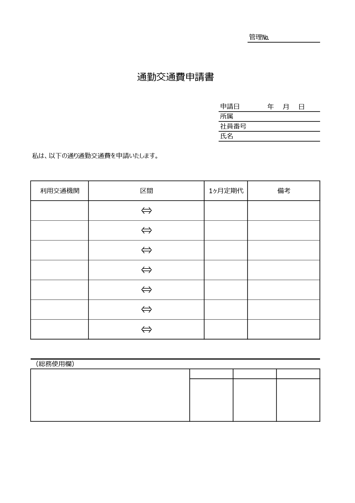 利用する交通機関と区間を記入が簡単に出来ます。月額定期代の申請書としてご利用ください。Excel、Wordはアレンジも可能ですので、「1ヶ月の定期代」という部分を「日付」、「備考」を「行先」などに変更することで、営業で利用した交通費を申請できる書類にもなります。用途に合わせてアレンジしてください。Excel、Word、PDFがあります。