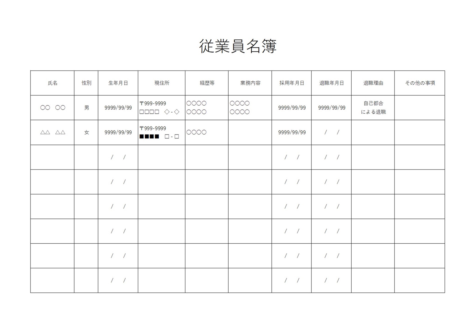 従業員名簿(必要な記載事項)手書きが簡単「Excel・Word・PDF」A4サイズで印刷の無料テンプレートとなります。従業員名簿を作成する時には特に決まりはありませんが、必要な記載事項がございます。最低限の必要な記載事項を兼ね備えたシンプルなフォーマットです。ダウンロード後にご利用頂けます。