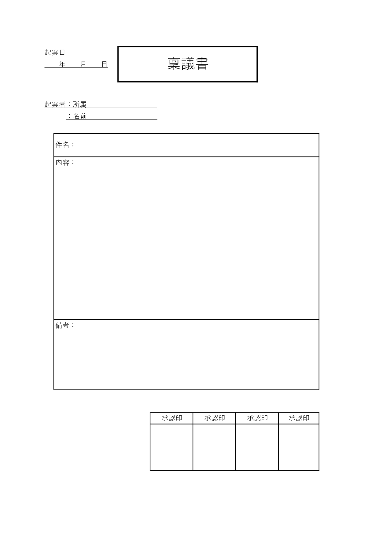 社内でお使い頂く稟議書のテンプレートです。個人の権限だけでは決定できない大切な事案については稟議申請し、複数の管理者や権限者から承認を得ることが必要になります。例えば、新規取引先と契約を開始してよいか、新規プロジェエクト進行許可、高額接待費や高額備品購入の承認、人材の雇用など上長の確認が必要なことは様々ですが、稟議書はいずれも共通フォーマットになります。収支計画書などの添付資料がある場合は添付してください。