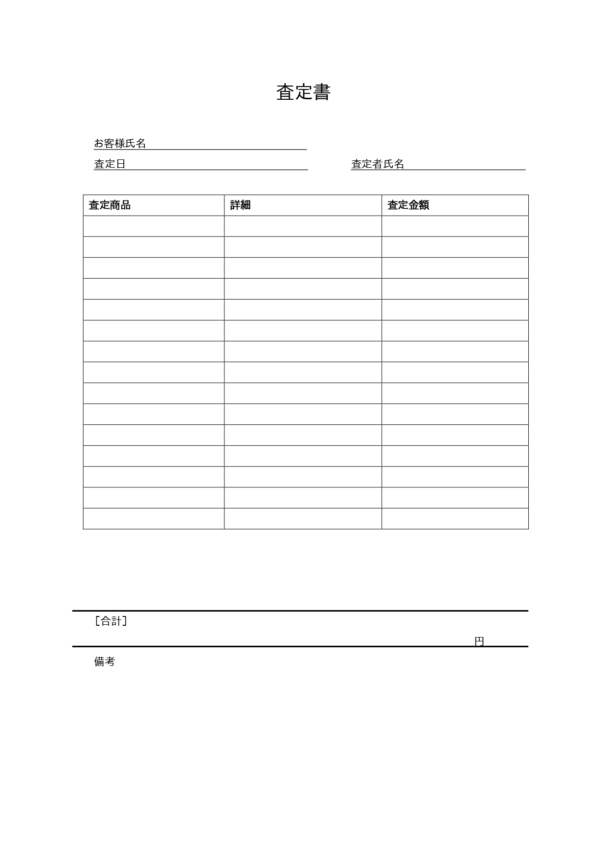 シンプルな形式の査定書になり、記入もしやすく、ご覧になる方も分かりやすい書式で、おすすめします。WordとPDFのご用意があります。