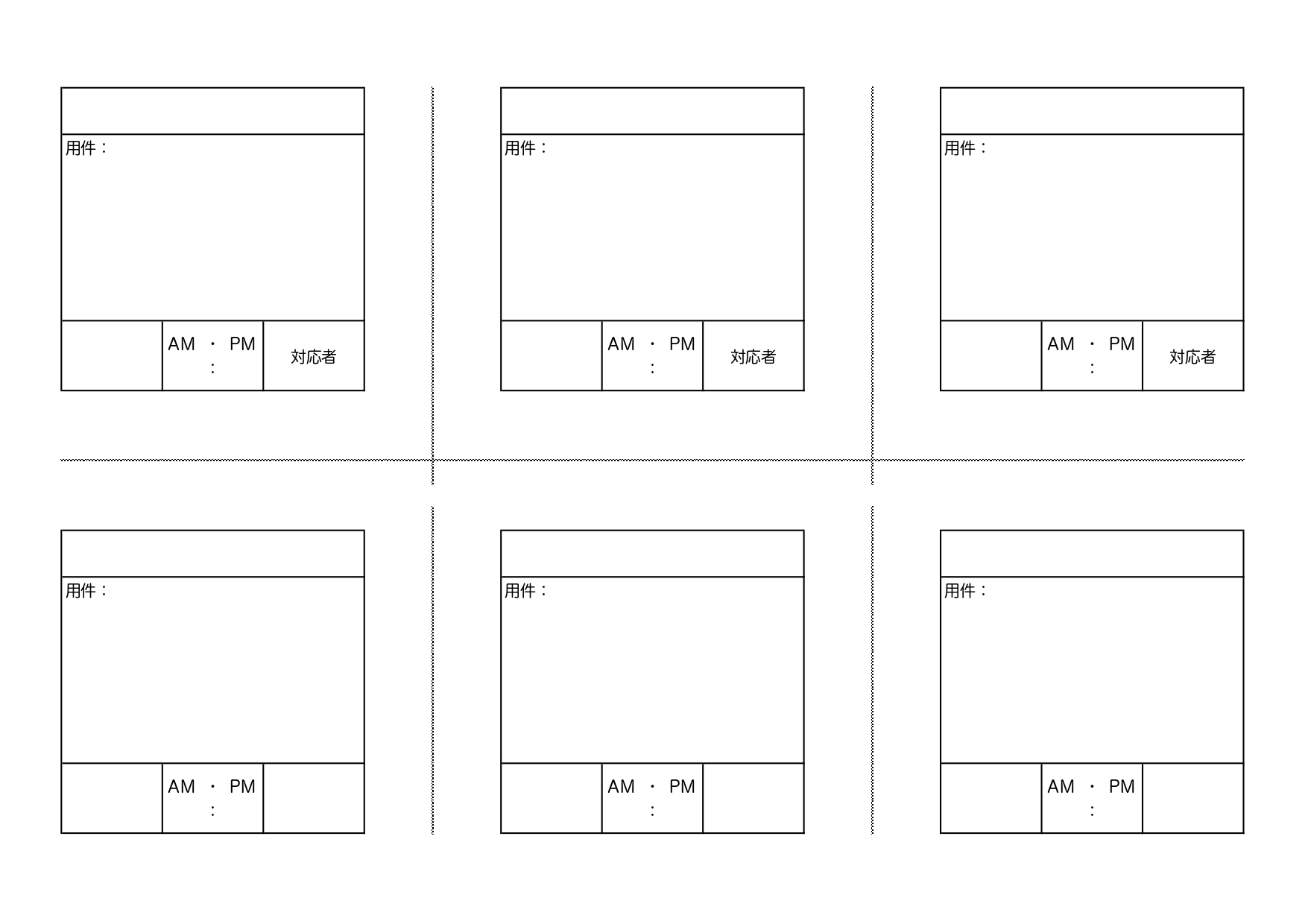 伝言メモのテンプレートです。データサイズはA4ですが、6分割になっているので点線で切ってから使用します。宛名、内容、伝言を受けた日付、時間、対応した人の名前の5項目の枠から成る、シンプルで使い勝手の良い伝言メモのテンプレートとなり、ダウンロード後にお好きな素材をご利用頂けます。