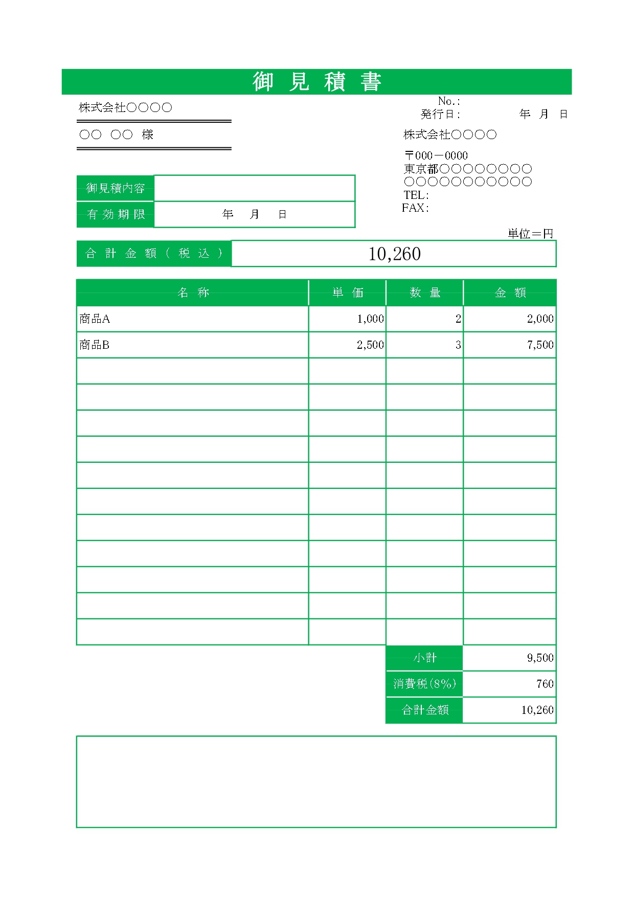 見積書「発行日・有効期限」シンプルなグリーン(緑色)デザイン「Excel」のテンプレートとなります。ダウンロードする事で編集可能なエクセルで利用可能です。シンプルで使いやすいカラー「グリーン」でデザインされております。白黒に変換し利用する事も可能です。見積書のエクセルは消費税の調整なども可能です。