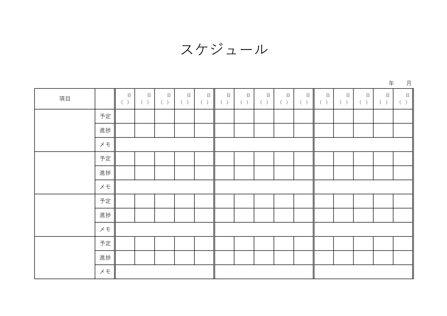 7日×15項目の縦様式のスケジュール表☆作業管理や業務進捗管理に便利に使える! 15個の項目の進捗を7日間で管理することができるスケジュール表となり、短期的に複数の工程がある方に便利ご利用頂けます。 工事現場や作業工程を管理する
