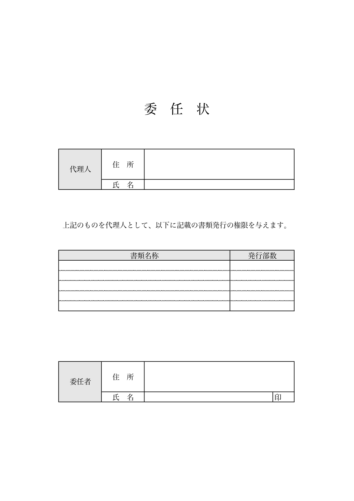 委任状は、何らかの権限を第三者や組織に預ける場合に作成される書類で、会議での議決権の委任、自動車の登録変更の委任、書類発行の委任など、日常生活の色々なシーンで使用されます。本テンプレートは基本的には書類の発行に関しての委任状の無料テンプレートとなります。