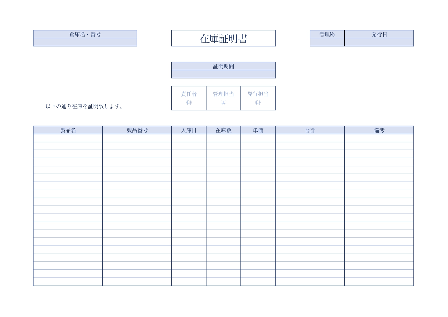 管理を依頼している側は、製品の追加発注の検討や月次の棚卸等、必要に合わせて在庫証明の発行を依頼することになります。倉庫名称や証明書に掲載する期間、製品名、品番、入庫日、数量、単価、金額を記録して使用するテンプレートです。在庫の管理には必須の内容を纏めた書類なので、製品の種類を問わずご使用いただけます。