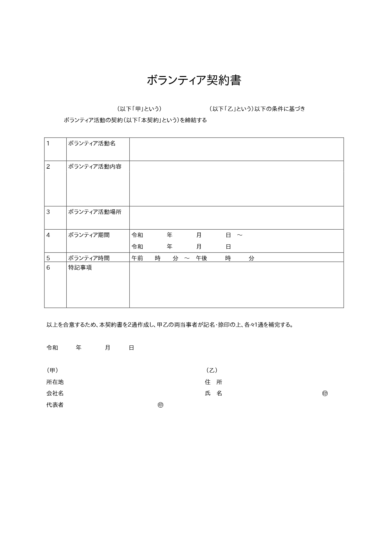 シンプルで見やすい!ボランティア契約書!項目簡単編集が出来るエクセルのテンプレートとなります。基本的な項目が最初に入っていますので、ボランティア内容により項目の編集や内容を入れる事で作成が可能です。活動内容、期間、特記事項などを編集し内容を