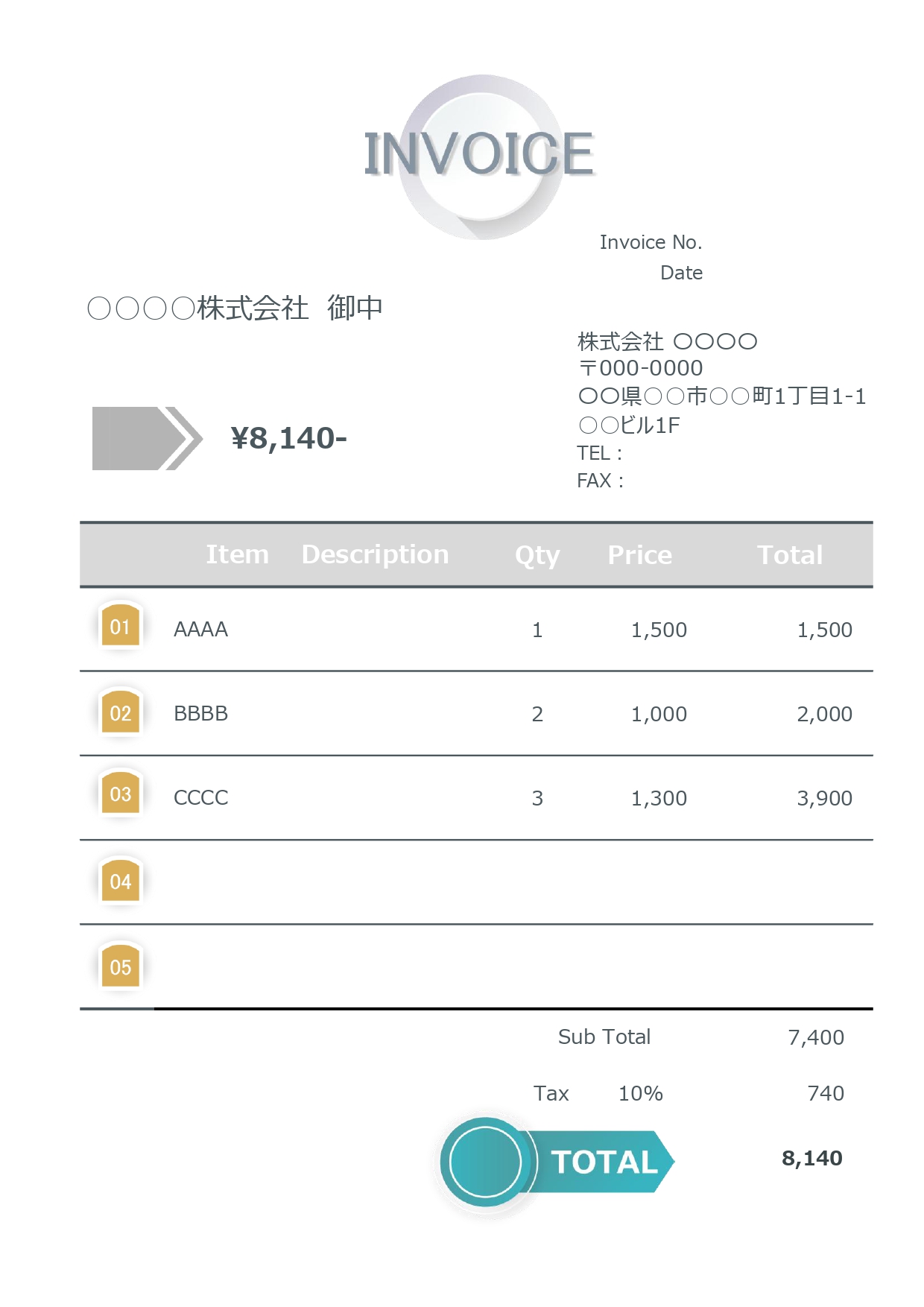 シンプルながらもどこかおしゃれ、そんな請求書となっています。目新しい斬新なデザインでインパクトのある請求書を作成することができます。デザイン会社、インテリア関連、個人経営者の方におすすめしたいテンプレート。単価と数量を入れると自動で計算されるよう計算式が入っています。