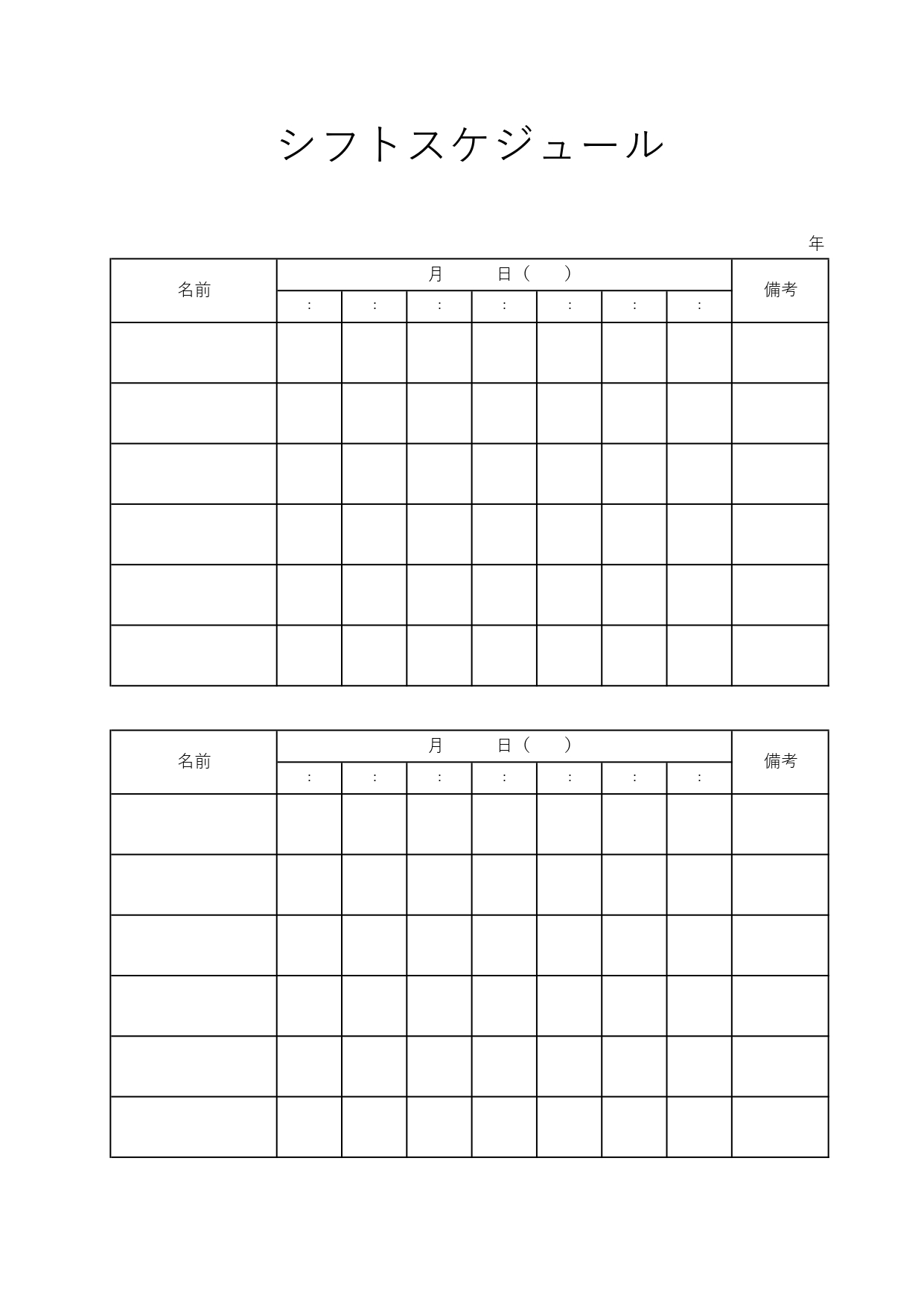 時間交代の従業員シフト表☆アレンジ自由で見やすい便利なテンプレート! 時間交代のシフトを行っている店舗などで、便利にご利用頂けるシフトスケジュール表の無料テンプレートです。A4の1枚で2日分、7名の管理できます。印刷して配布したり、貼