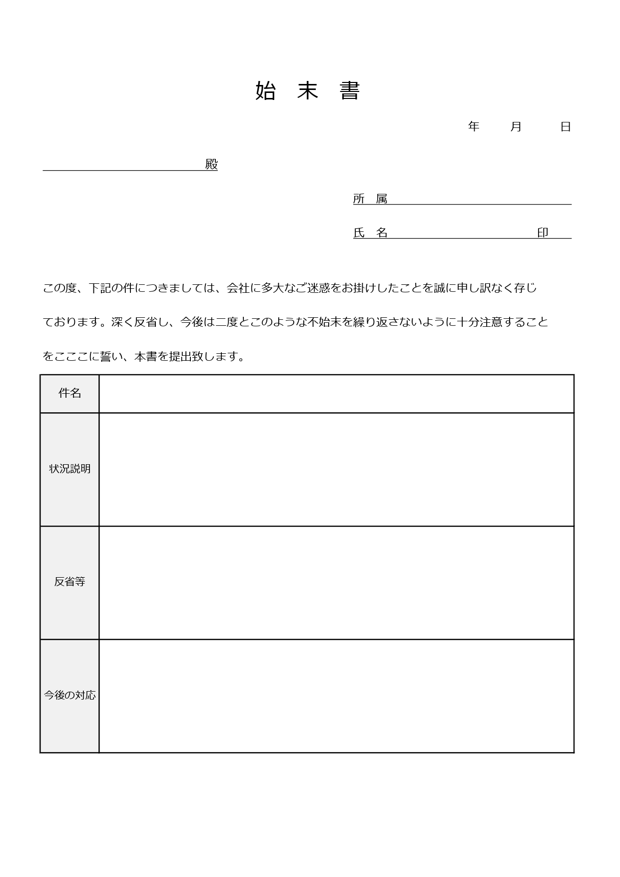 謝罪と再発防止の誓いの文が予め入った便利な始末書のテンプレート! 冒頭に、謝罪と再発防止の誓いの文が予め入った丁寧で誠意の伝わる始末書のテンプレートです。始末書は反省と誠意をしっかり伝えるために、読み手に伝わりやすい書類に仕上げること
