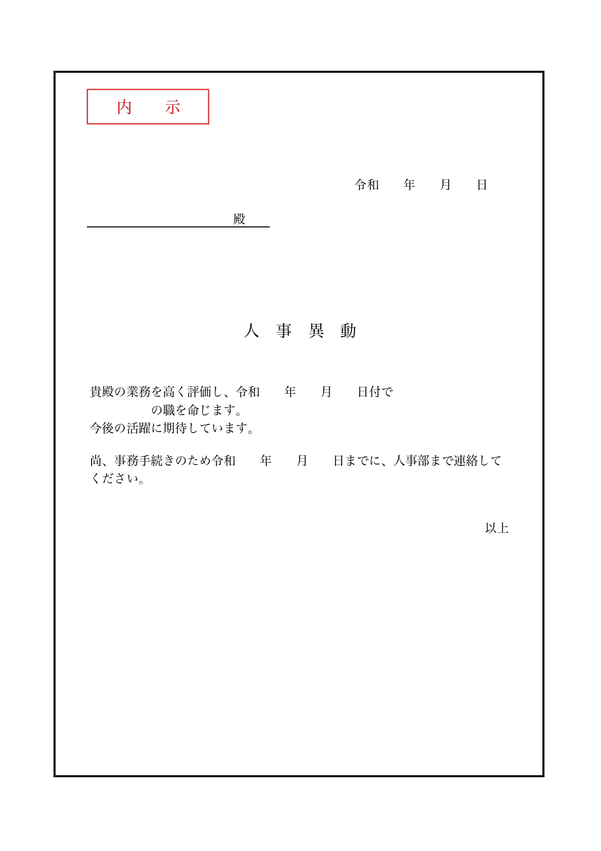栄転を想定してサンプルを作成したので、「今後の活躍に期待しています。」という言葉を入れていますが、状況や習慣により変更しても良いでしょう。簡易的な内示を行う場合などに編集し利用ください。