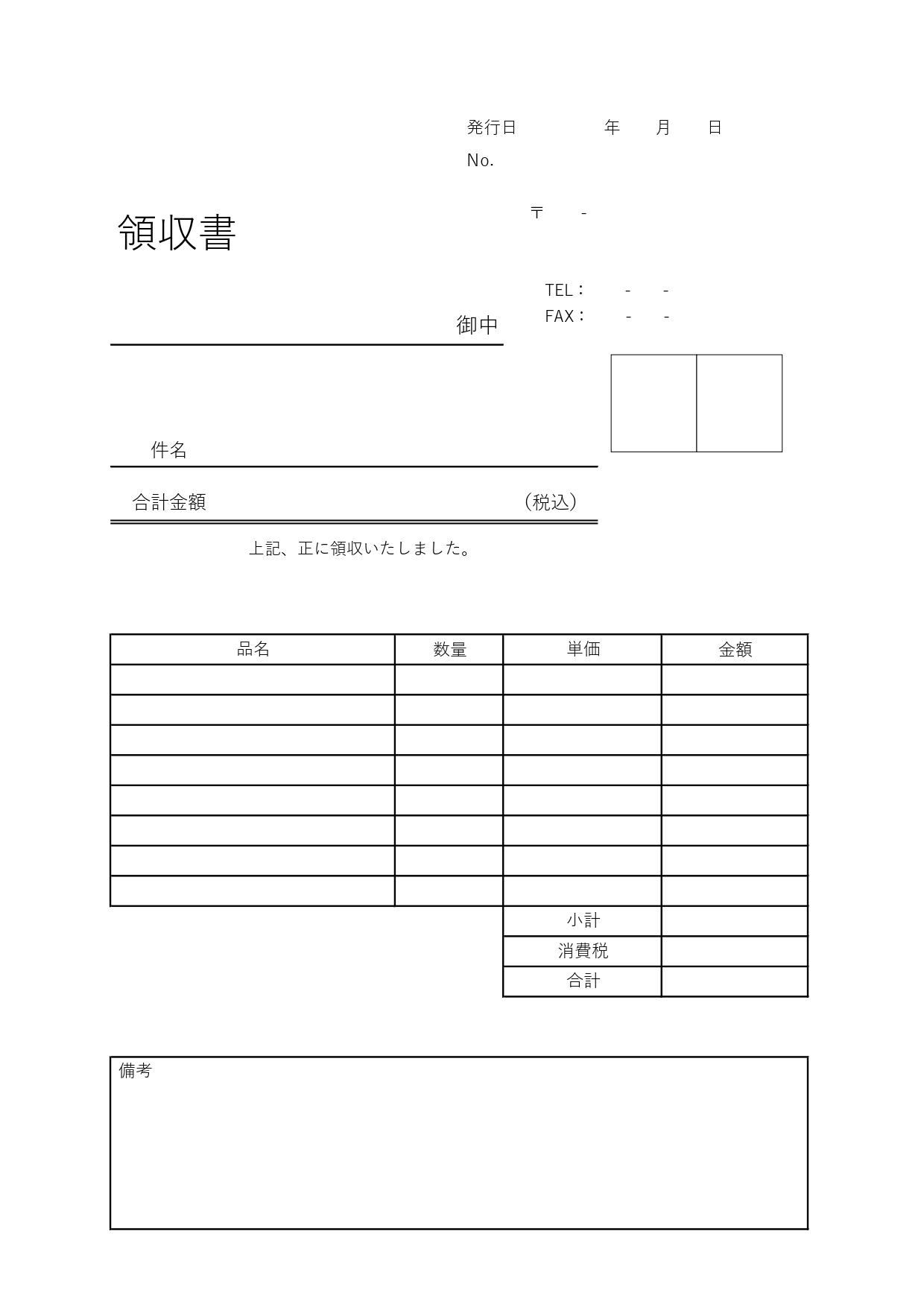 件名の横の四角いフレームは捺印や印紙を貼るスペースとしてご利用ください。エクセルは、計算式が入っていますので、数量と単価を記入するだけで、合計金額などは自動で表示されます。備考欄は注文書No.や請求書No.などを記載するなど、必要に応じてご自由にお使いください。