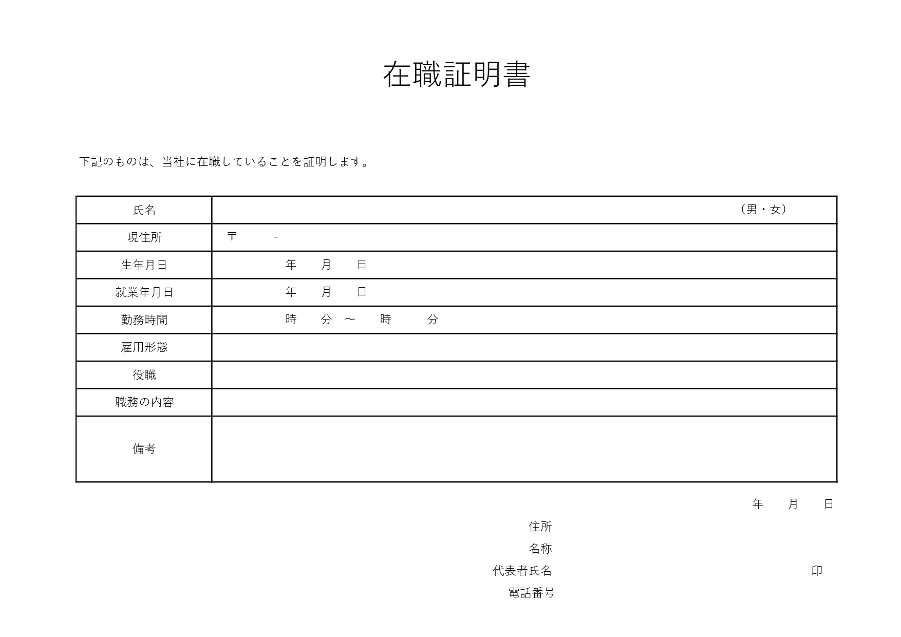 書き方が簡単な標準的な在職証明書(エクセルで簡単編集)が出来るフォーマットとなります。会社に決まったフォーマットが無い場合に保育園や幼稚園の入園に提出する書類と
