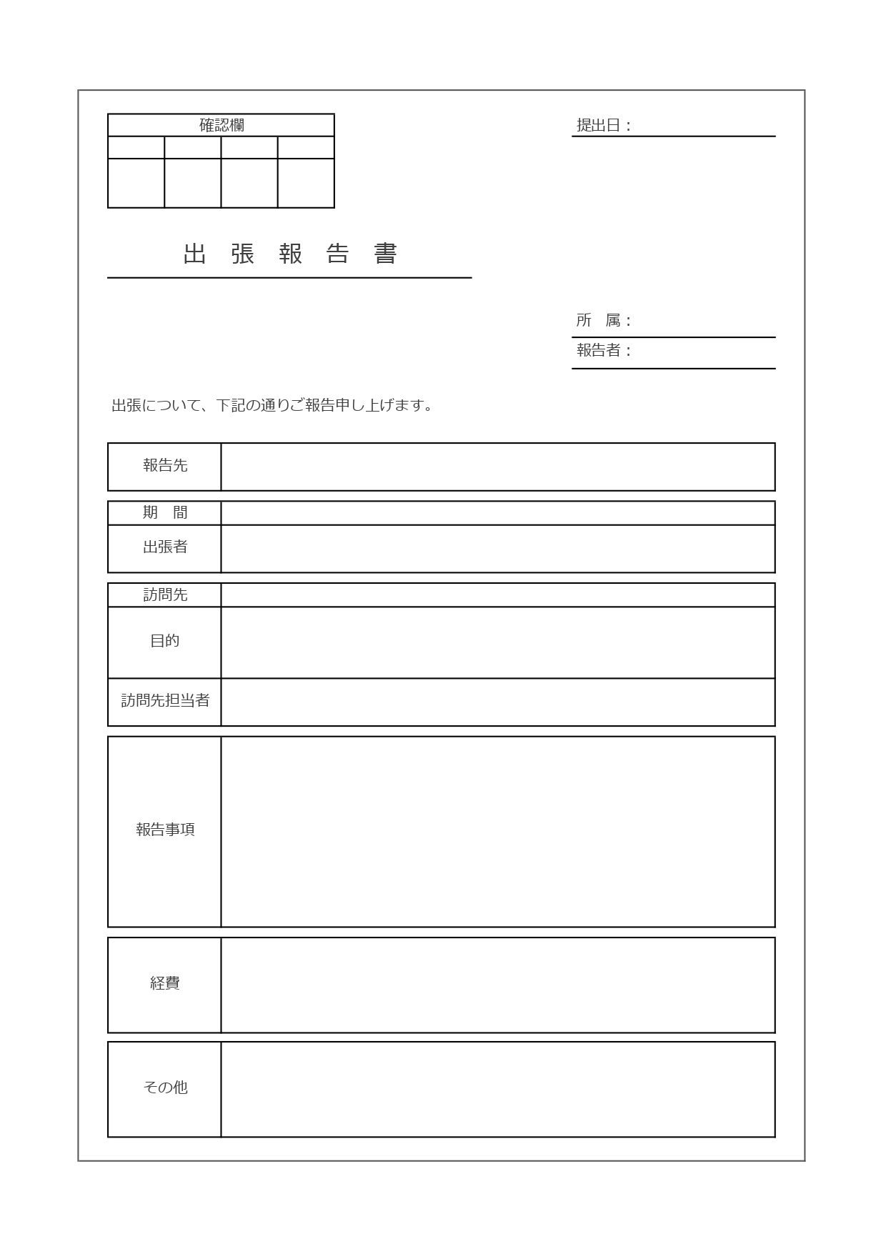 出張報告書に最低限記載しておく必要のある、出張者、出張先、日程、目的、報告事項(内容、成果、所感など)、出張経費について、項目ごとに記録欄を設けているので報告漏れがありません。設置項目以外にも特別に報告したい内容がある場合にはその他の記入欄に記録する事が出来ます。