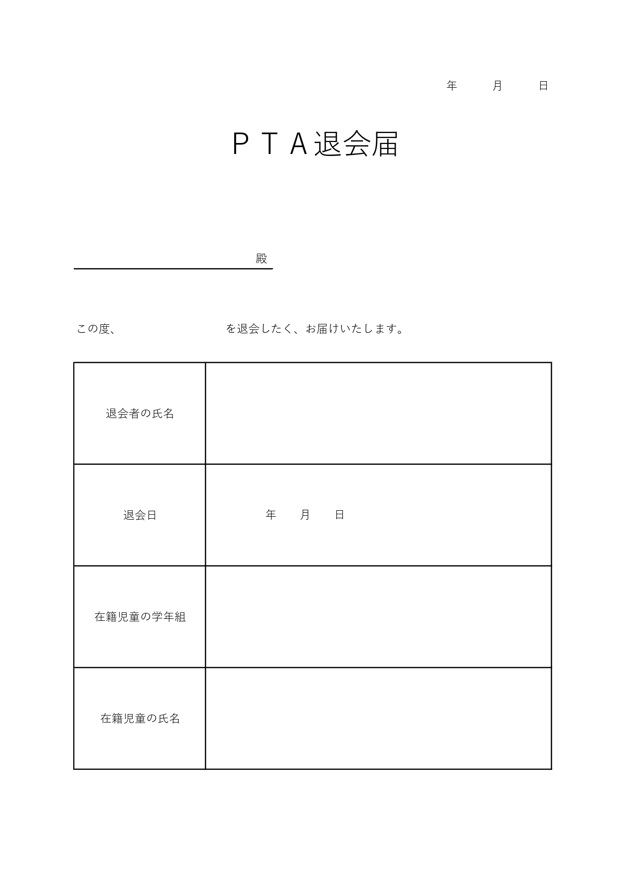 手書きで書き方が簡単なPTA退会届(横書き)シンプルな枠ありで見やすいテンプレートとなります。退会届を作成する時に横書きの手書きで記載したい場合などに最適です。