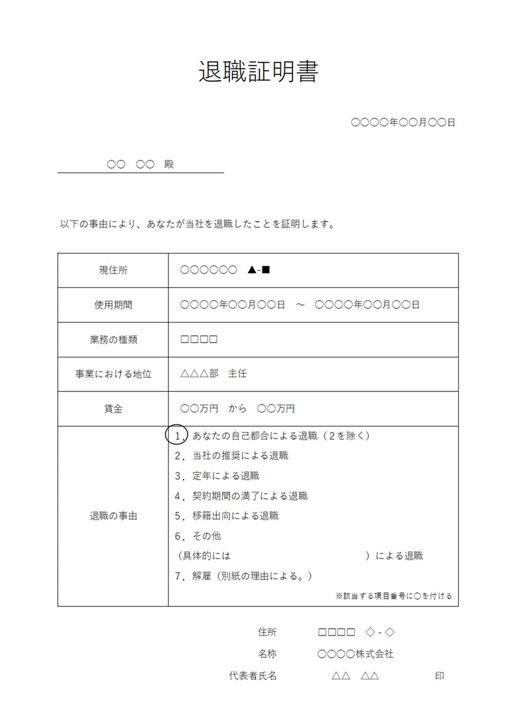 表形式の退職証明書で入力簡単・見やすいテンプレート!退職事由は選択式で時短作成! 罫線で囲まれた表形式の退職証明書のテンプレートです。表形式は入力がしやすく、簡潔にまとまるのでおすすめします。退職事由は、番号に〇を付けて選ぶだけでOK