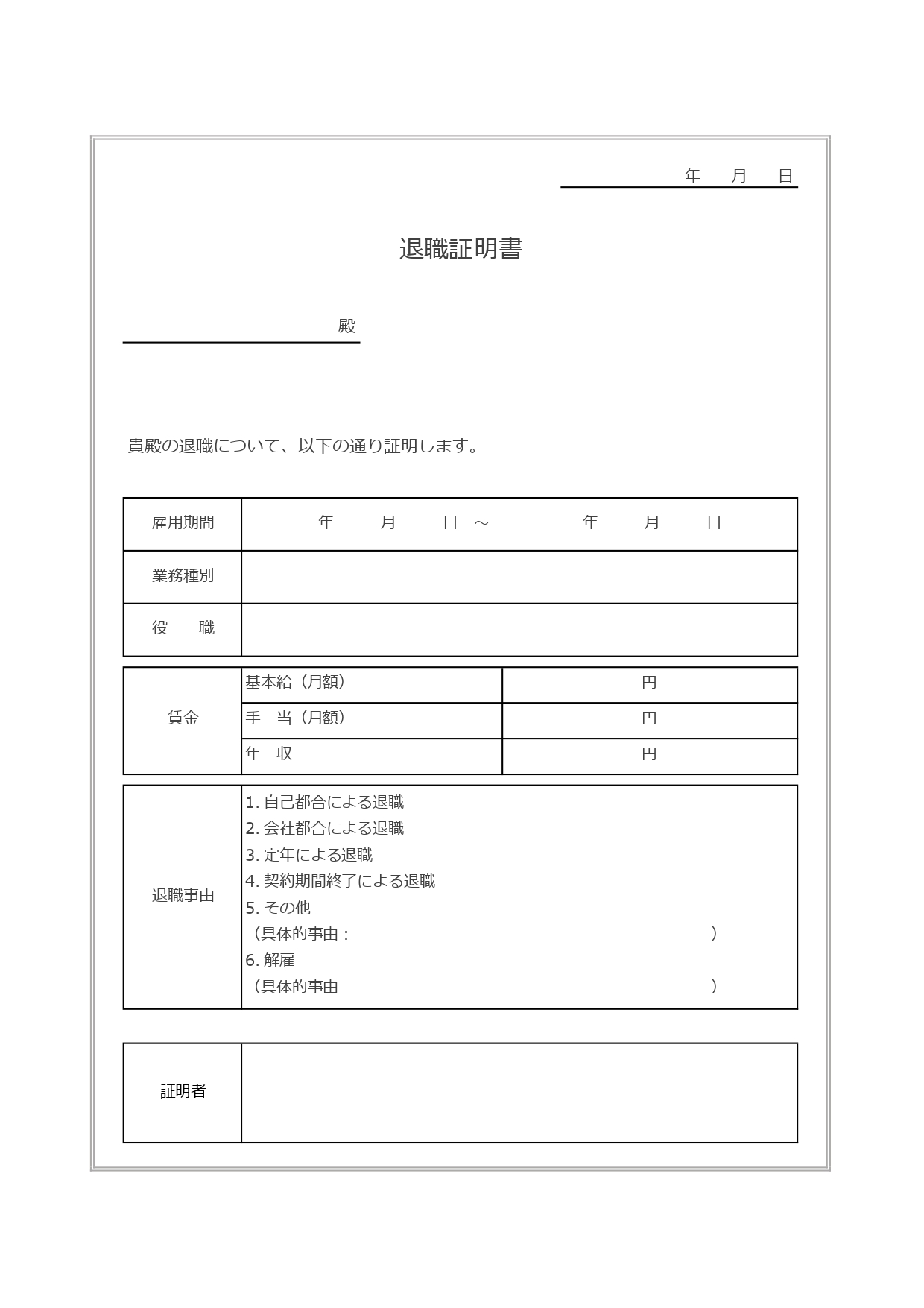 通常の退職証明書には、雇用期間、業務種別、役職、賃金、退職事由などから必要に合わせた事項が明記されますが、本テンプレートにはその全ての記入項目を設けたので幅広い状況で使用が可能です。無料ダウンロード後に編集を行いご利用くださいませ。