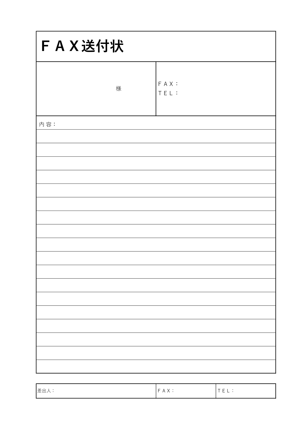 FAX送付状のテンプレートが用意されているととても便利です。こちらのテンプレートは、FAX送付状のタイトル、宛先、FAX、TELといった送り主の情報、内容が記載されているので便利です。備考欄は罫線で区切られているので、安心してご利用いただけます。