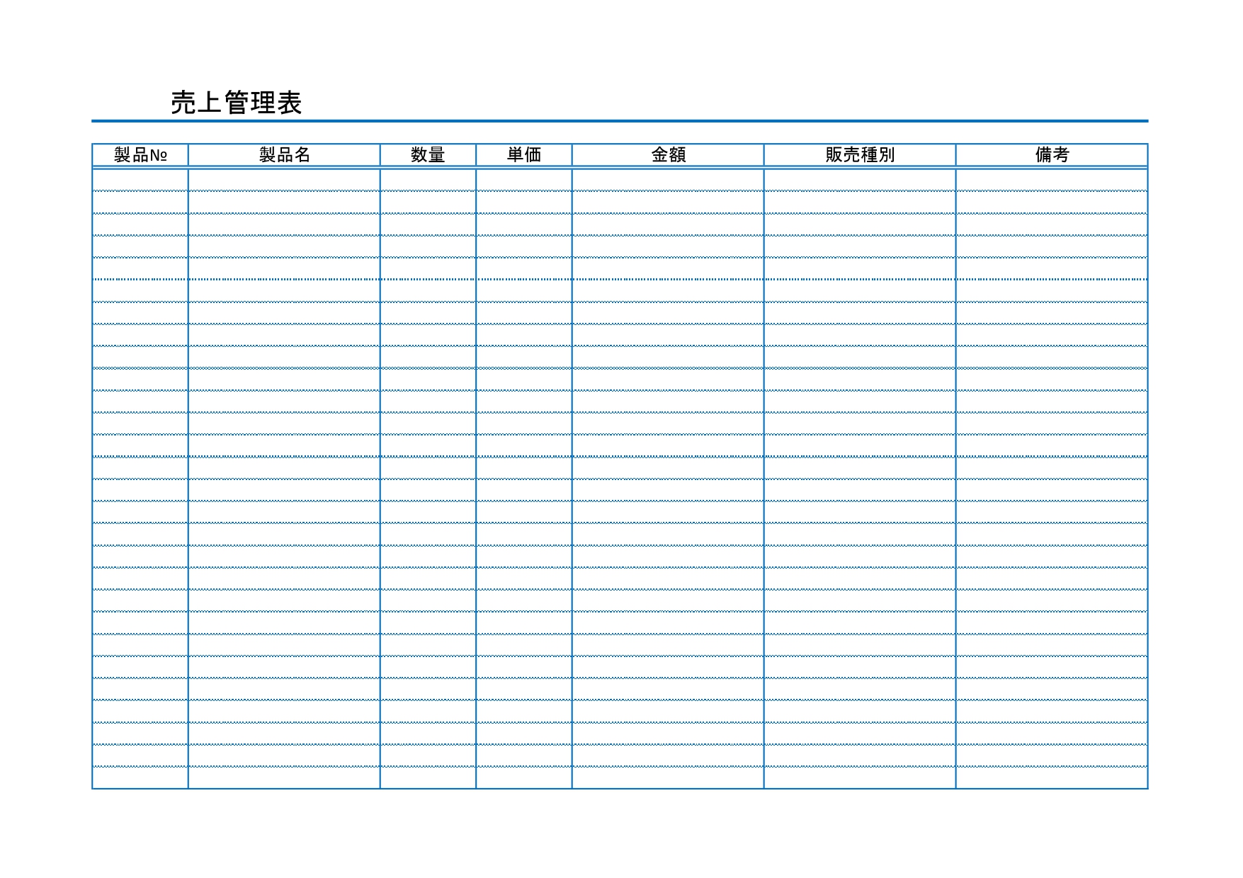 本テンプレートは、製品№、製品名、数量、単価、金額、販売種別(店舗、オンライン等の販売方法や販売場所の区分)、備考の記入項目から成っています。製品種別や販売場所を問わず、日ごと、週毎、月ごとと、どのような区切りでも使用できる販売管理表のフォーマットです。