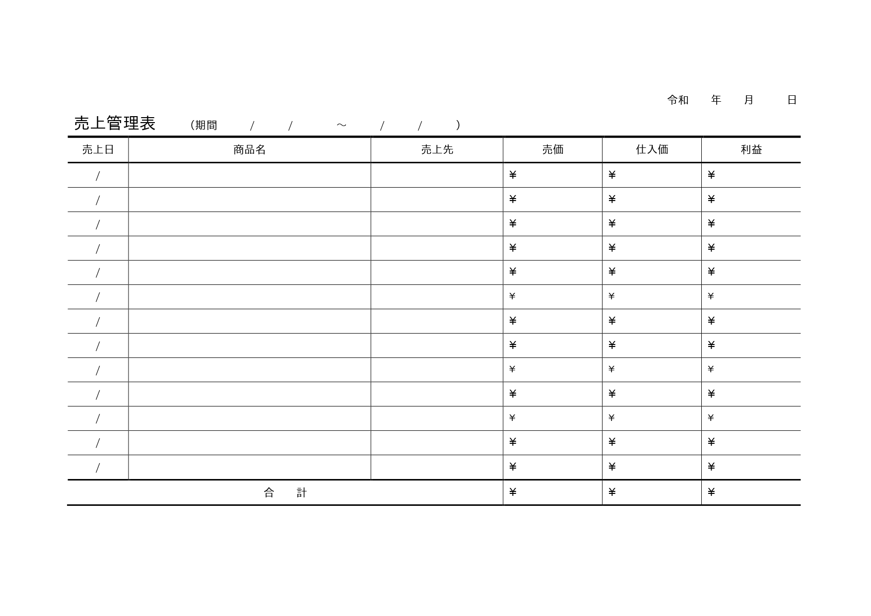 売上管理表のテンプレートとなり、営業マンが売上進捗を管理するのに向いています。売上日、商品名、売上先、売価、仕入価、利益の構成です。週単位、月単位などはご自由に設定できます。