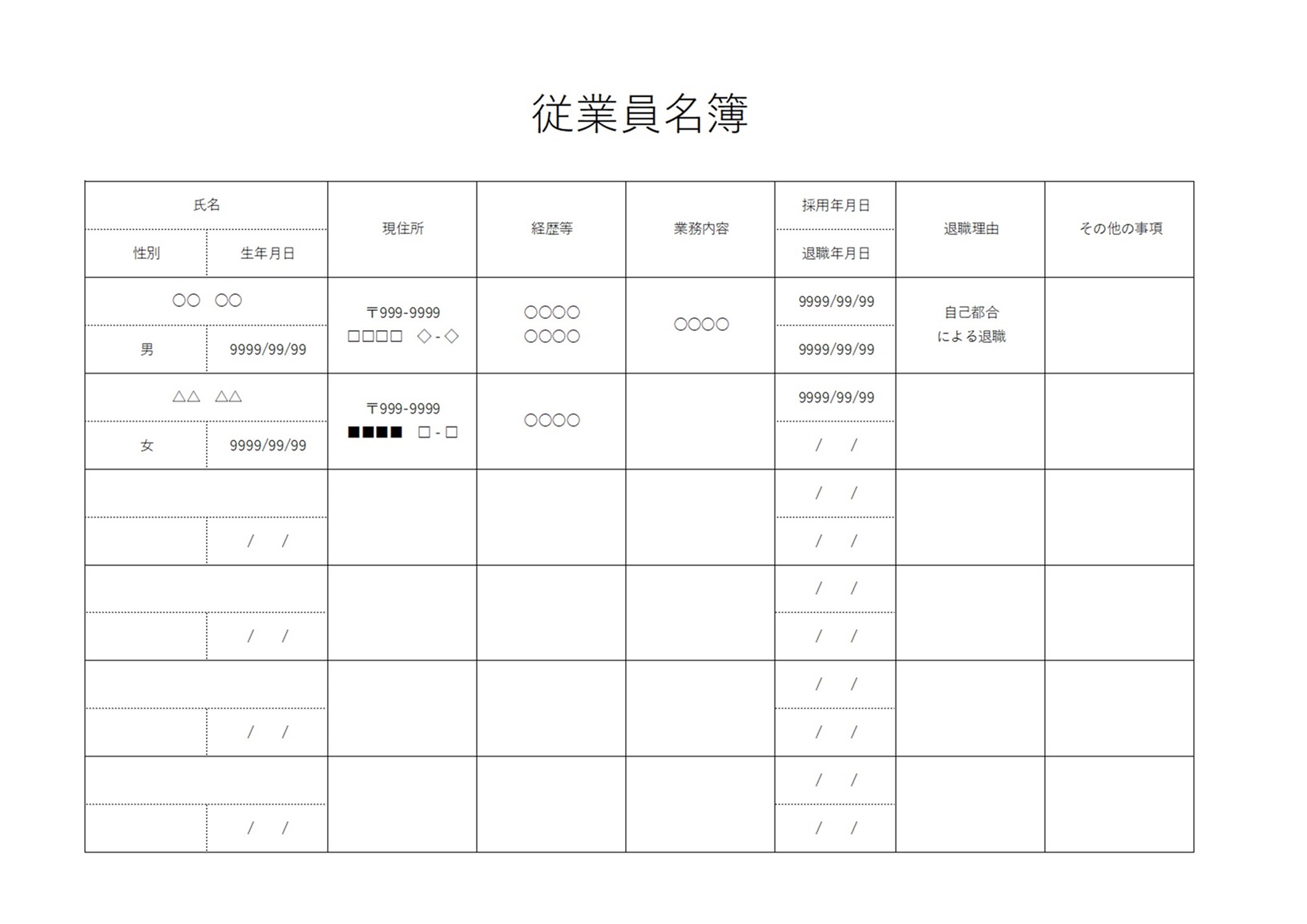 こちらのテンプレートはA4サイズ1枚で6人分をまとめることができます。従業員の情報で明記しなければならない、必須項目が網羅されているので、項目通り記載頂くと、簡単に従業員名簿が作成できます。シンプルなフォーマットのため、人事担当者が変更された場合でも、どなたでもすぐに分かる管理のしやすいテンプレートです。