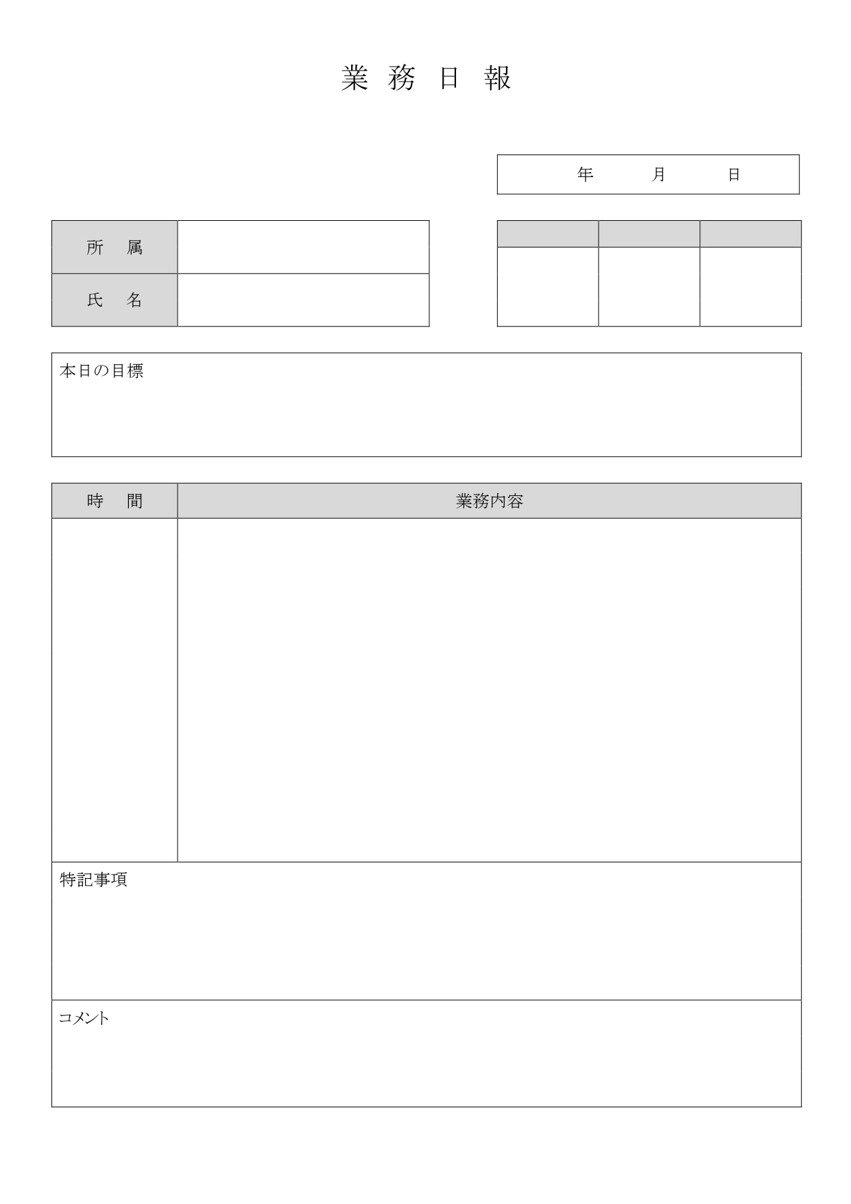 シンプルな業務日報のテンプレート☆店舗や現場など手書きで報告する方におすすめのフォーマット! 最初にその日の目標が明確になる分かりやすい項目があります。業務内容