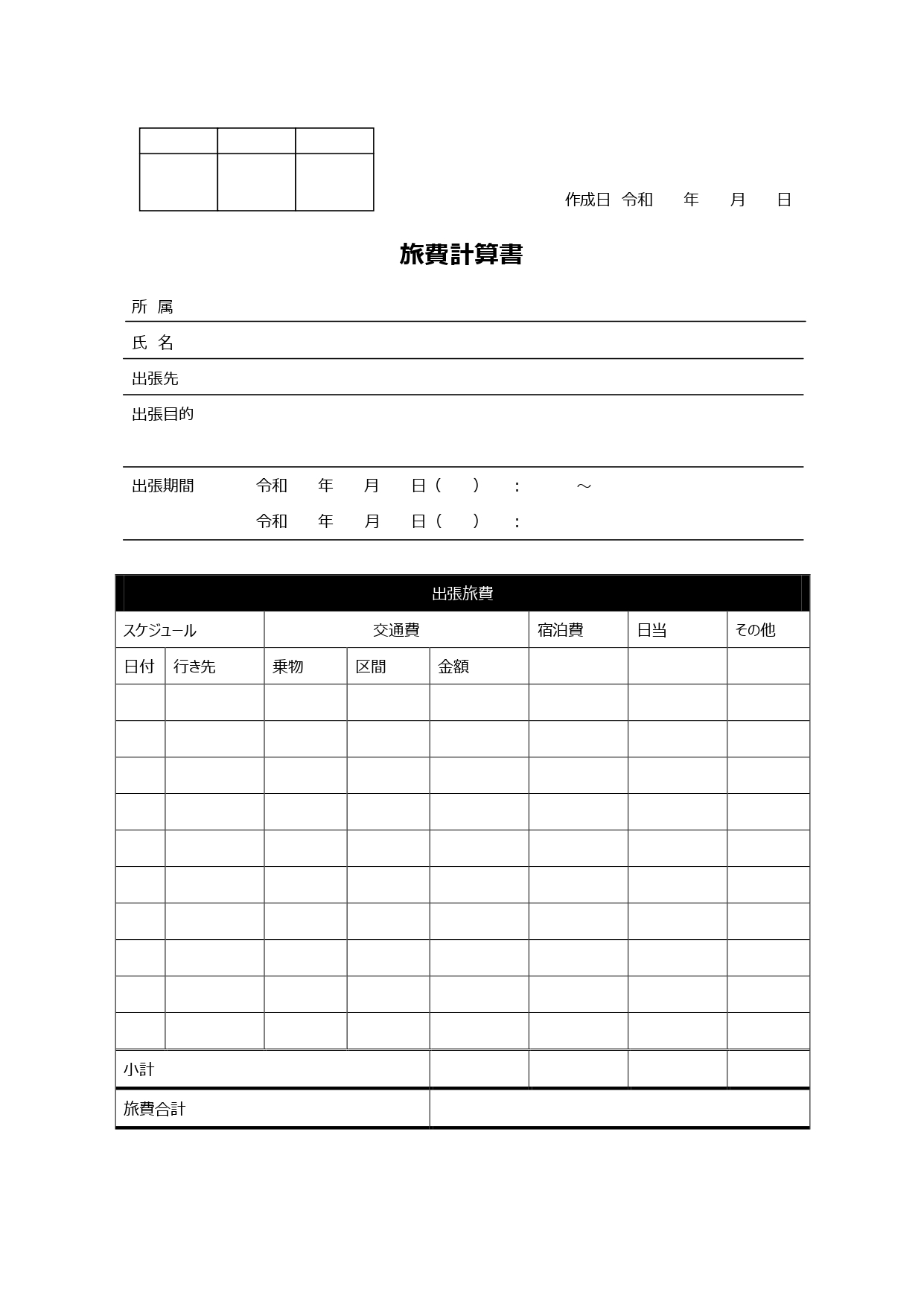 出張旅費計算書(清算書)シンプルな項目の様式!エクセルで簡単に項目編集・手書きで記入可能なテンプレートとなります。出張などに行った場合に、交通費やホテル代など出張に関わる経費を清算する為の計算書となります。エクセルで簡単に金額や項目を記入する事で作成が出来ます。ダウンロードしご利用ください。