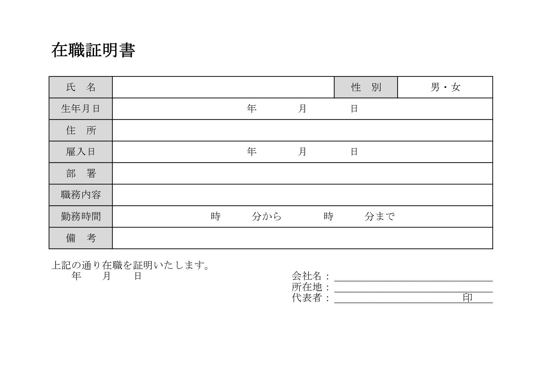 A4横向き、縦書きタイプの在職証明書のテンプレート◎項目少な目でスピーディーに作成が可能の便利なフォーマット! 氏名、生年月日、住所、雇入日と、発行元企業名の基本情報のみで簡単に作成できる在職証明書です。加筆事項があれば、ご自由に編集